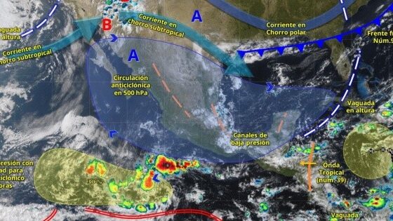 A trough in the Gulf of Mexico, a low pressure channel and tropical wave number 39 will favor the entry of humidity to the east and southeast of the country. In addition to the rains, wind gusts of up to 70 km/h are expected in the Isthmus of Tehuantepec and high waves, mainly on the coasts of Oaxaca, Chiapas and Veracruz.