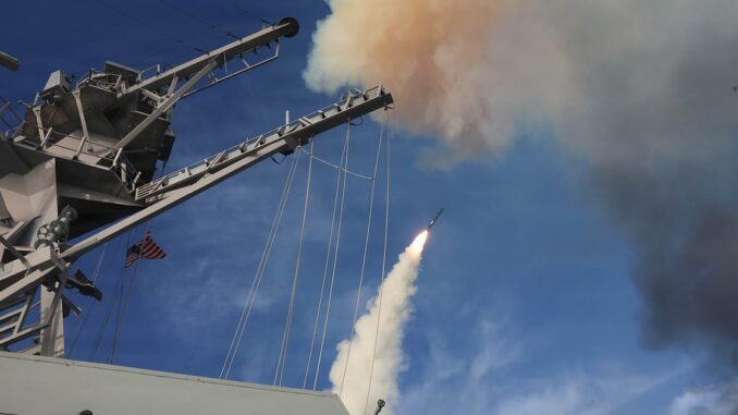 A Tomahawk fired from the destroyer USS Thomas Hudner. According to the Washington Post, 850 missiles of this type were spent in the first four weeks of the war.US NAVY