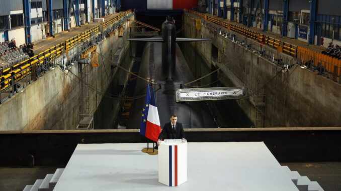 Macron spoke at the nuclear submarine base on Longue Island, near Brest, in Brittany.EPA / YOAN VALAT / POOL
