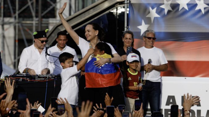 In Madrid, one of the favorite destinations of Venezuelans who emigrated en masse in recent years due to the crisis in their country, Machado led a demonstration in their support.