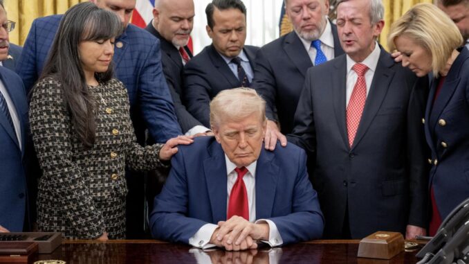The North American president, with this ritual of mysticism that he thinks so well, appears in the Oval Despacho surrounded by a group of evangelical pastors who, with the hands of their men, cry out to the Almighty for the political (and physical) health of the tycoon.