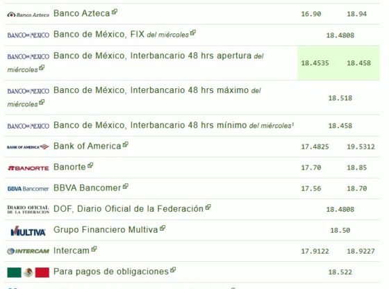 When purchasing, the lowest price is 16.90 pesos per dollar offered by Banco Azteca, and the highest is: 18.0895 pesos per dollar offered by Banco BX+.
