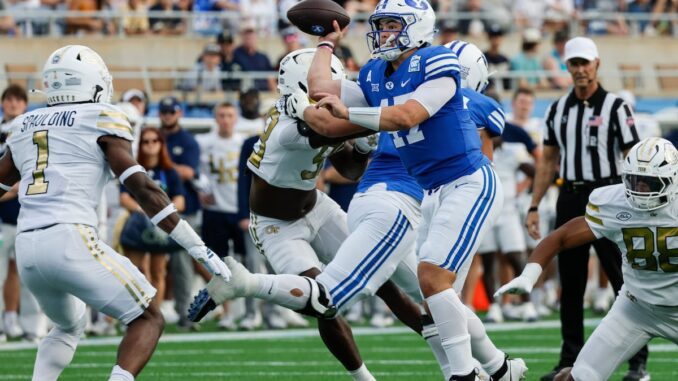 BYU linebacker Bear Bachmeier (47) throws the ball under pressure from the Georgia Tech defense during the first half of the NCAA college football game Pop-Tarts Bowl, Saturday, Dec. 27, 2025, in Orlando, Fla. (AP Photo/Kevin Kolczynski)