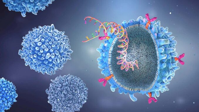 Illustration of a CAR T-cell with an implanted gene stem resulting from the genetic modification process needed to fight rogue cells in the body