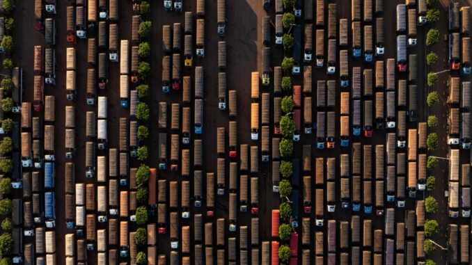 Some of the thousands of trucks that carry soybeans along the road in the Amazon